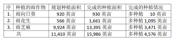 本漂县区今年雨作物种植季节期间规划种植向日葵、雨花生及雨芝麻等油料作物11,490英亩,实际种植时共种植了这些油料作物15,986英亩。各种油料作物规划种植面积及实际完成的种植面积如下表: