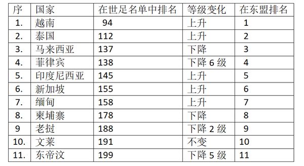 在现在10月份世足协会公布的排名表中,东盟各国的排名情况如下: