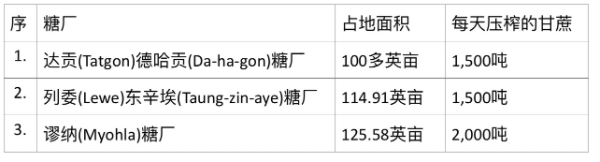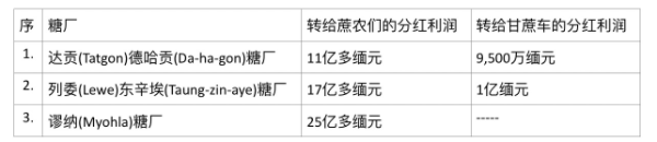 勃固省东部的谬纳(Myo-hla)糖厂、内比都列委(Lewe)县区内的东辛埃(Taung-zin-aye)糖厂及达贡(Tat-gon)县区内的德哈贡(Da-ha-gon)糖厂,向这3家糖厂出售甘蔗的有关蔗农,就获得了糖厂方面所给予的白糖分红利润。