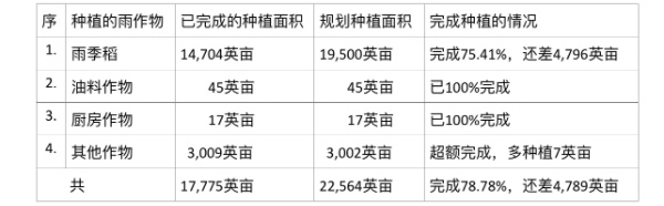 今年雨作物种植季节期间,茂叻县区规划种植各种雨作物22,564英亩,自5月份开始有关种植工作,到目前完成了各种作物17,775英亩的种植工作,完成了规划面积的78.78%。