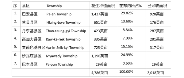 而采收方面,巴本县区已全部完成有关采收工作了,但这县区却是种植面积最少的县区。妙瓦底县区则还没有开始采收工作,是地区不平静无法进行采收工作,还是其他原因不得而知。而种植面积最多的巴安县区,则有65%的花生田完成了采收工作。