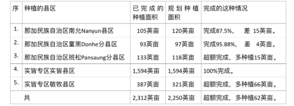 实皆省内目前完成洋葱种植工作的县区及其种植面积以及原规划种植面积如下表: