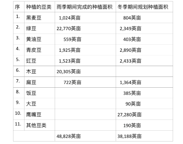 今年雨作物种植季节期间,昌吴县规划种植各种豆类51,233英亩,自今年5月开始有关种植工作,到目前为止已完成了各种豆类48,828英亩的种植工作。