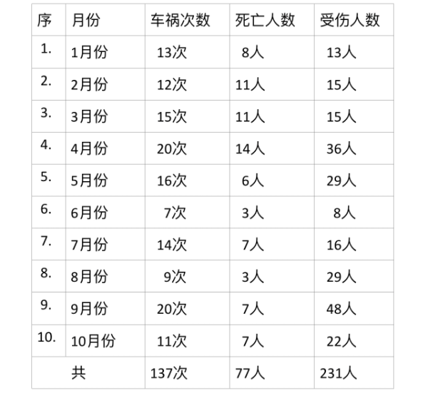 这十个月期间发生的车祸次数及死伤人数如下表: