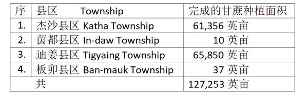 杰沙专区内下辖四个县区,分别为杰沙县区、茵都(Indaw)县区、迪姜(Tigyaing)县区及板卯(Banmauk)县区,今年各县区所完成的甘蔗种植面积如下表: