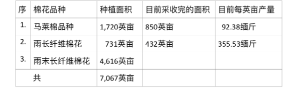 各种品种棉花的采收情况,马莱棉已有850英亩采收完毕,每英亩产量为92.38缅斤(1缅斤约等于1.6公斤)。雨长纤维棉花已采收432英亩,每英亩平均产量为355.53缅斤,这是由县农田管理暨统计局方面获知的讯息。