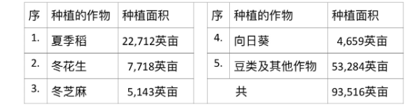本年度冬作物种植季节中,榜地县区规划种植的各种作物包括夏季稻2万多英亩,各种油料作物17,000多英亩,各种豆类及其他作物5万多英亩。各种作物的具体种植面积如下: