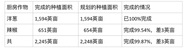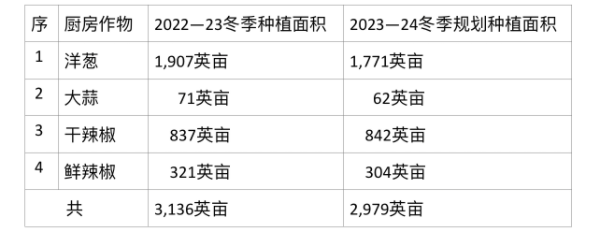 而在该年度冬作物种植季节期间又种植了各种厨房作物共3,136英亩。在2023—24本财政年度冬作物种植季节期间也规划种植各种厨房作物共2,979英亩。各种厨房作物的种植面积如下表: