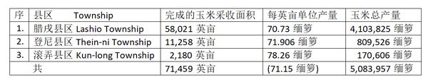 专区内的3个县区中,腊戌县区完成的这玉米采收面积为最多,滚弄县区完成的采收面积虽然少,但单位产量却是最高。
