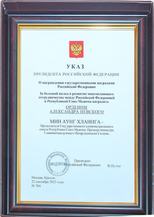 声明中称,俄罗斯安全委员会秘书尼古拉·帕特鲁舍夫将俄罗斯总统弗拉基米尔·普京授予的亚历山大·涅夫斯基勋章(Order of Alexander Nevsky)授予缅甸国家管理委员会主席敏昂莱大将。
