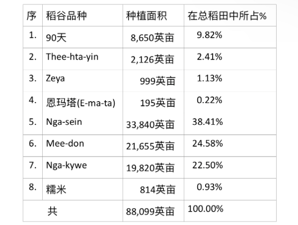 种植的8种稻谷品种中,以Nga-sein、Mee-don及Nga-kywe这3种品种种植面积为最多,这3种稻谷品种种植面积就占了85%以上的面积,这些是20世纪期间在伊洛瓦底江三角洲地区传统种植的稻谷品种。