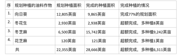 可以发现,除了向日葵这一作物外,其他油料作物都已超额完成了规划种植面积。特别是芝麻,完成的种植面积远超过规划种植面积,是种植面积最多的油料作物了。