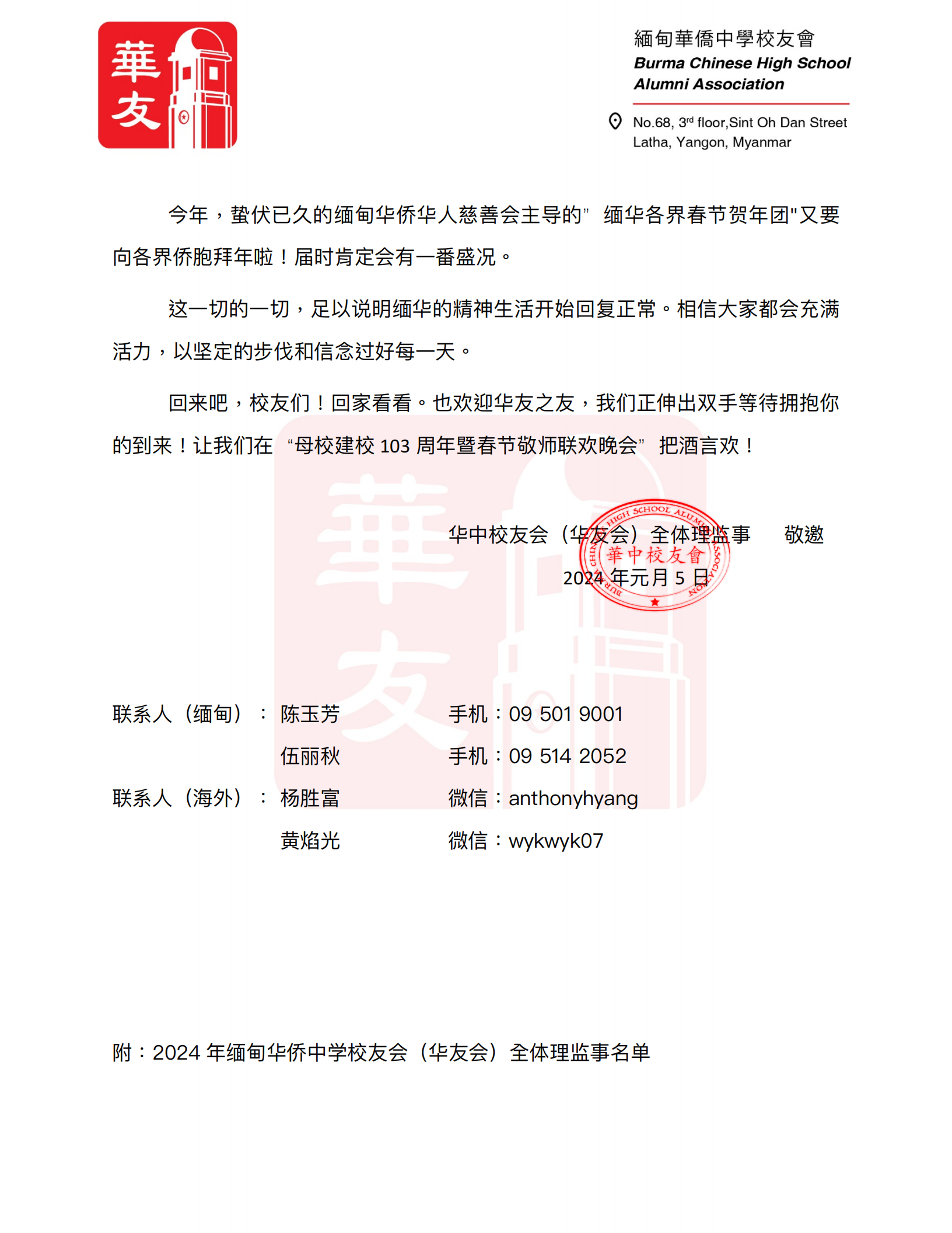 缅甸华侨中学建校103周年暨春节敬师联欢邀请函
