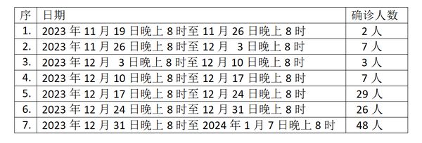 自2023年11月中旬开始,卫生部就不再公布每天疫情蔓延的情况,改为一星期公布一次。最近几个星期每周的确诊人数如下表: