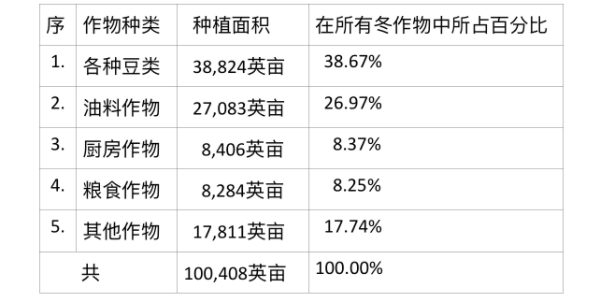 种植的各种冬作物中,以各种豆类种植面积为最多,几乎占了冬作物总种植面积的五分之二,而油料作物种植面积次之,占冬作物总种植面积的 ¼ 以上。