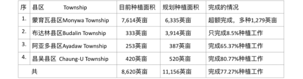 专区所辖的4个县区中,蒙育瓦县区目前完成的洋葱种植面积为最多,其已超额完成规划种植面积,多种植了1,279英亩,其种植面积占全专区种植面积的88.33%。而布德林县区规划面积虽占专区第二,但目前完成的种植面积不到10%。