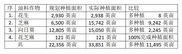 本漂县区在冬作物种植季节期间,为增加当地农夫们的收入及满足本地区食用油的需求,规划种植花生、芝麻、向日葵及花芝麻等油料作物共22,356英亩,地面上实际种植时共种植了这些油料作物33,851英亩。各种油料作物规划种植面积及实际种植面积如下表: