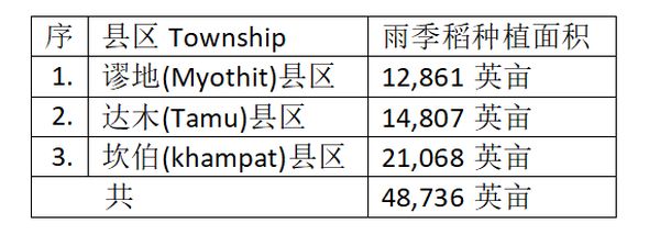 专区内的谬地(Myothit)、达木及坎伯(Khampat)各县区的种植面积分别如下: