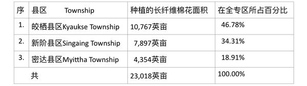 据4月4日出版的缅文《镜报》报导,曼德勒省皎栖(Kyaukse)专区是主要从事农耕工作的一个地区,种植各种庄稼农作物,其中也种植工业原料作物棉花。在2023—24财政年度雨末时期就种植了长纤维棉花23,018英亩,目前已采收完毕的棉田共有4,300英亩,各县区种植的长纤维棉花面积如下表: