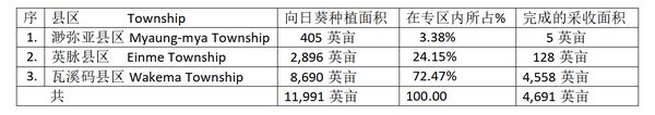 渺弥亚专区内所属的县区有渺弥亚、英脉(Einme)及瓦溪码(Wakema)这三县区,这三县区所种植的向日葵面积及如今完成的采收面积如下表: