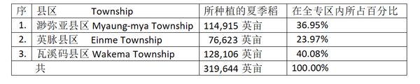 渺弥亚专区在今年夏作物种植季节时原本规划种植夏季稻316,287英亩,自2023年12月第2周开始有关种植工作,到今天完成了319,644英亩的种植工作,多种植了3,357英亩。专区内的3县区各自完成的种植面积如下表: