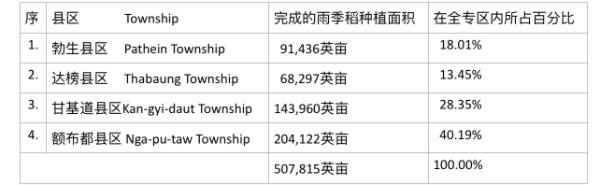 按:额布都县区是勃生专区内一重要的农业县,在2023年雨季稻种植时期,勃生专区种植了50多万英亩雨季稻,其中额布都县区就种植了20多万英亩,那时勃生专区各县区种植的夏季稻面积如下表:
