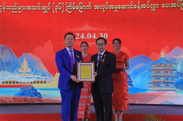 2023年5月9日,缅甸中华总商会在第十届世界华侨华人社团联谊大会被授予“华社之光”特别荣誉,全球仅10家社团荣获这一殊荣。“博施济众,筑起35万民众的疫苗屏障;通商惠工,书写‘胞波情长’的友谊篇章。在‘一带一路’上,播撒民心相通的种子;在华校课堂上,架起文化交融的桥梁。过百岁仍老当益壮,饮一江水情谊越流越长。”上述评价正式这份华社最高荣耀给予商会的褒奖。为让嘉宾代表们感受到这一份荣光,就职典礼现场播放了社团联谊大会上缅甸中华总商会的荣耀时刻。