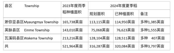 渺弥亚专区是伊洛瓦底省内一重要的农业生产地区,该专区下辖渺弥亚(Myaung-mya)县区、英脉(Einme)县区及瓦溪码(Wakema)县区这3个县区,这3县区都是重要的稻谷生产地区,3县区在2023年雨季时期种植的雨季稻面积及现在2024年夏季稻种植面积如下表: