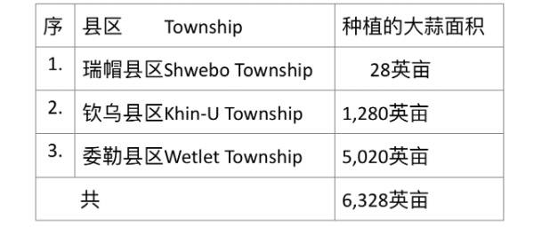 在刚过去的冬作物种植季节期间瑞帽专区内的各县区所种植的大蒜面积如下表: