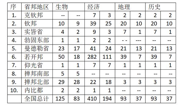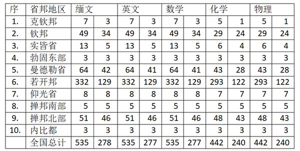 各学科栏目中,第一栏目是注册人数,第二栏目是实际考试人数。例如,全国缅文科注册人数是535人,实际考试人数是278人;若开邦经济科注册人数是282人,实际考试人数是111人。