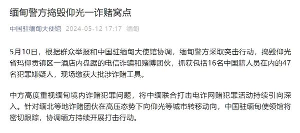 5月10日,根据群众举报和中国驻缅甸大使馆协调,缅甸警方采取突击行动,捣毁仰光省玛仰贡镇区一酒店内盘踞的电信诈骗和赌博团伙,抓获包括16名中国籍人员在内的47名犯罪嫌疑人,现场缴获大批涉诈赌工具。