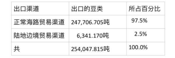 出口这豆类时,由海路渠道出口达到97.5%,由边贸渠道出口只占2.5%的比例,海路渠道出口是边贸渠道的39倍了。