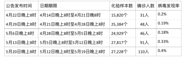 最近五个星期卫生部公告中所发现的疫情确诊人数表: