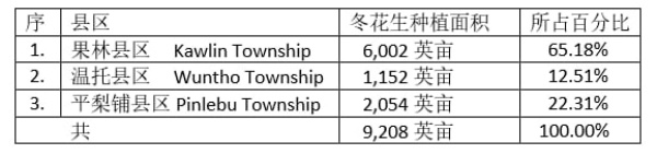 在刚过去的冬作物种植季节期间果林专区种植的油料作物冬花生的采收工作是在今年(2024年) 2月开始进行的,现在9,208英亩冬花生都已全部采收完毕,平均每英亩花生产量达到72.78缅箩。