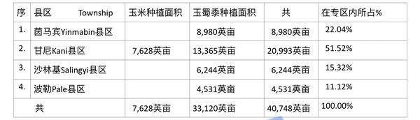 四个县区中,以甘尼县区种植面积为最多,占了全专区这玉米玉蜀黍种植面积的一半以上,其次是茵马宾县区,种植面积超过全专区种植面积的五分之一以上。