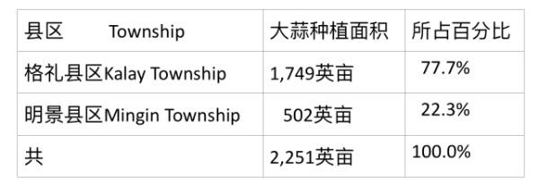 专区内的3个县区中,格礼瓦 县区没有种植此大蒜作物,剩下的2个县区中,格礼县区种植的大蒜占全专区种植面积的 ¾ 以上,明景县区种植面积则不到全专区种植面积的 ¼ 。