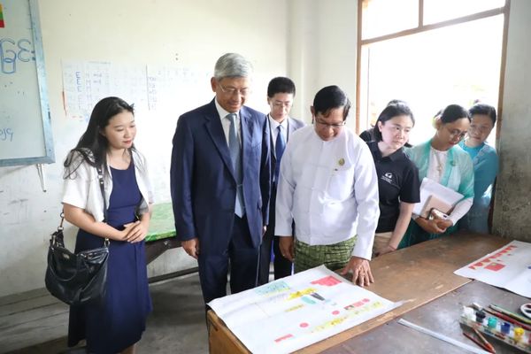学生代表发言感谢中方捐赠,表示捐赠物品有助于其更好学习生活,将努力学习,传承缅中友好。陈海大使和梭登首席部长还共同参观学校,观看学生们使用捐赠文具创作的中缅友好绘画作品。