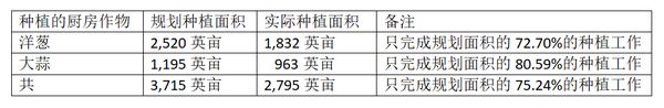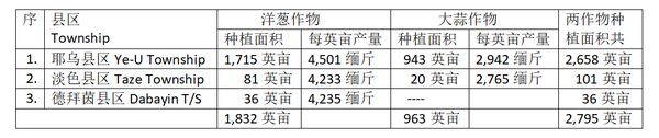 而专区内的各县区所完成的洋葱及大蒜种植面积及各作物的每英亩单位产量如下表: