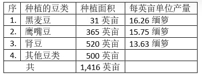 坎底县区在过去的冬作物种植季节期间种植的各种豆类及这些豆类每英亩的产量如下表: