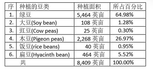 在这2024—25财政年度雨作物种植季节中,明景县区规划种植的各种豆类及种植面积如下表: