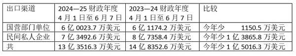 在2023—24财政年度同期,由2023年4月1日至6月7日期间,这工业成品出口情况为:由国营部门单位出口6亿1174.2万美元,由民间私营企业出口8亿7358.4万美元,故上一年度同期这工业成品共出口14亿8532.6万美元。