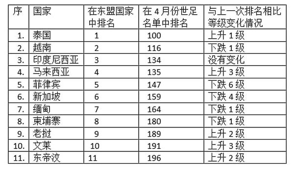目前东盟国家足球队在世足公布的名单中排名情况: