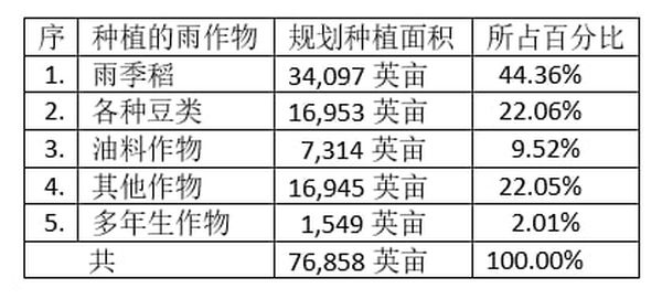 规划种植的的各种雨作物中,以雨季稻种植面积为最多,几乎占全部雨作物种植面积的一半;其次是各种豆类,种植面积将近所有雨作物种植面积的的 ¼ 。