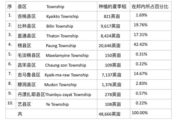 在刚过去的夏作物种植季节期间,孟邦规划种植48,666英亩夏季稻,邦内10个县区分别种植的夏季稻如下表: