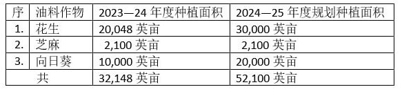 在过去的财政年度内,孟邦种植了花生、芝麻及向日葵这三种油料作物3万多英亩,在本财政年度内将规划扩大种植到5万多英亩。在过去的财政年度内孟邦的食用油自给率达到17.81%,而本财政年度则预估这食用油自给率将达到35%。