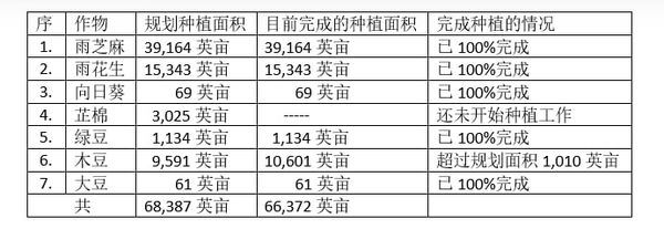 大部分作物已百分之百完成有关种植工作了,只有芷棉还未开始种植。木豆的种植面积甚至超过规划种植面积,这是三大出口豆类之一,在其他地区木豆种植面积大都比不上绿豆,在包康县区内木豆种植面积却超过了绿豆。