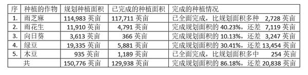 东墩基县区在2024—25财政年度雨作物种植季节期间规划种植雨芝麻、雨花生、雨向日葵、绿豆及木豆等作物。各作物的规划种植面积及直到7月份第二周结束时所完成的有关种植面积如下表: