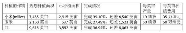 在现在2024—25财政年度雨作物种植季节期间,苗县区规划种植的小米及玉米作物的种植面积、目前完成的种植面积、每英亩可能获得的产量及每英亩种植费用如下表: