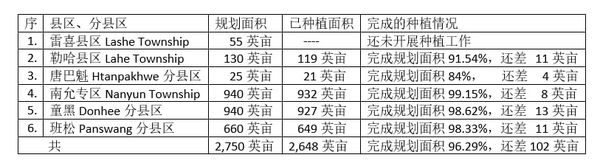 本年度内,那加民族自治区内的各县区、分县区 规划种植的木薯面积及已完成的种植面积如下表: