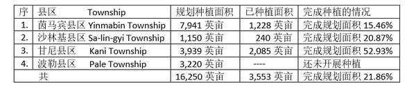 四个县区中,茵马宾县区规划种植面积最多,占了全专区规划种植面积的约一半。就目前完成的种植工作来说,甘尼县区完成的种植面积为最多。
